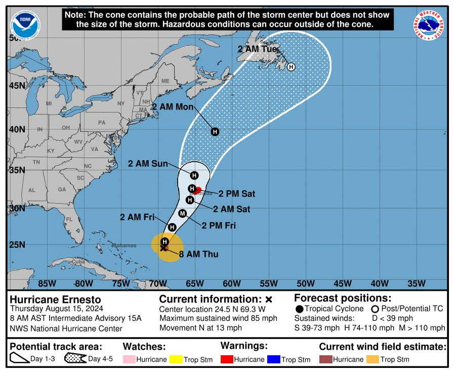 Hurricane Ernesto is still heading towards Bermuda. This storm is now expected to make it to a Cat 3 just before dropping back down to a 2. There is still a risk to eastern Canada, specifically Newfoundland. By the time it reaches up here, it will likely be downgraded to a post tropical storm but may still carry the characteristics of a Cat 1 hurricane. Time will tell, but the ocean temps are high enough to support this storm.