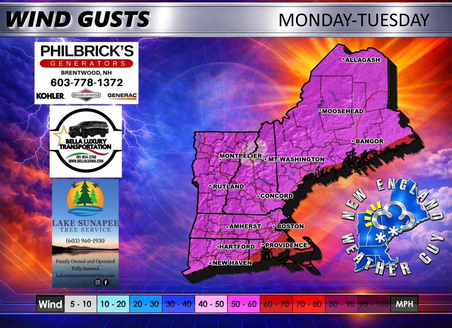 The wind map I included is your maximum expected wind gusts. Average wind gusts will be in the 20-30mph range, higher at the coast.